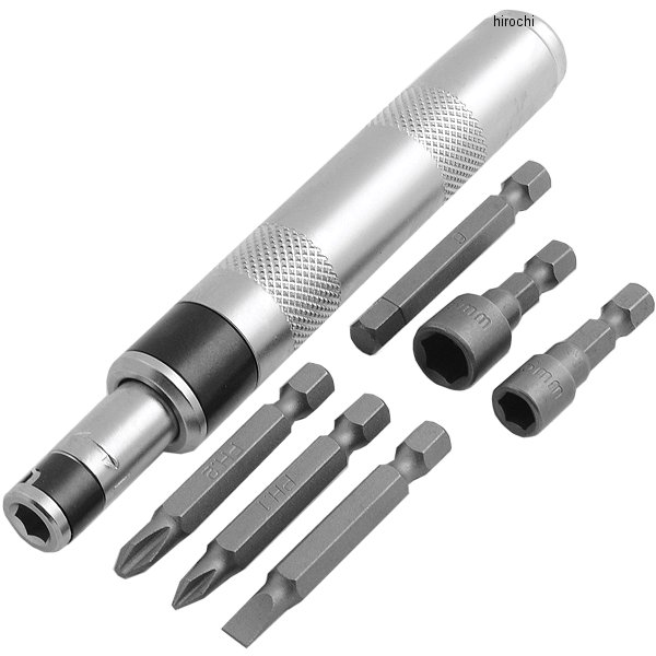 デイトナ バイク用小型ショックドライバーセット重量:約230g【サイズ】グリップ部:φ19長さ:110mm本体全長:140mm【付属品】・+ビット(PH1)・+ビット(PH2)・-ビット(5mm)・ヘックスビット(6mm)・六角ソケット(6mm)・六角ソケット(8mm)