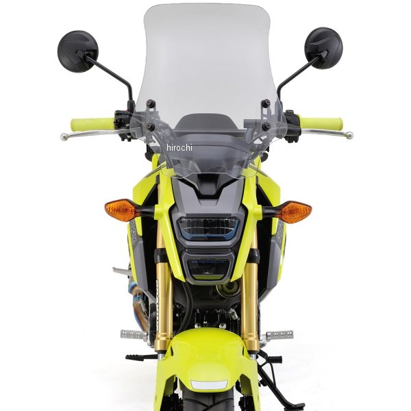 デイトナ ウインドシールドRS16年 ホンダ グロムMSX125SF※LEDヘッドライトモデル専用素材:ポリカーボネートシールド寸法:全長440mm(センター430mm)×幅375mm×厚み3mm車種専用取付ステー、オプションバー(Φ22.2×58L)付き【特徴】小さく跳ね上がったスクリーン上端のスポイラーが正面からの風を上部へ送り、体への風圧を軽減。ウインドシールド本体は、高い透明度と耐久性を両立した3mm厚ポリカーボネート製。同厚のアクリルに対し約30倍の強度を誇る素材にはハードコート処理を施し、耐傷性も高めました。ウインドシールドの角度調節(約10度)が可能な車種専用の取付ステー付き。