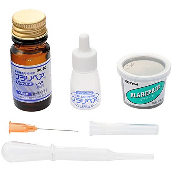 デイトナ プラリペアカラー:ブラック樹脂粉末:5gリキッド10ml補修の難しかったノーマルカウルと、ABS樹脂やプラスチック部品の補修及び成型が簡単にできる画期的な補修、成型剤「プラリペア」。接着ではなく樹脂化してしまうため強固な補修が可能。ノーマルカウルを補修した後、再転倒しても補修箇所の周りが割れてしまう、というスゴサ。ショップからのおスミ付き商品。