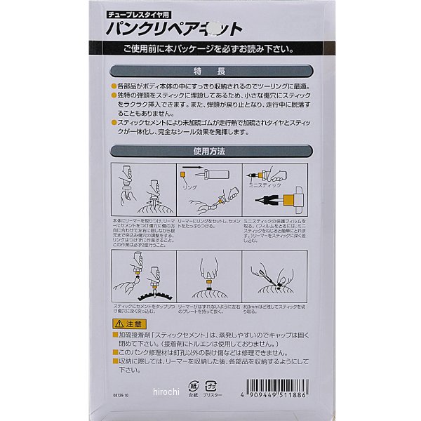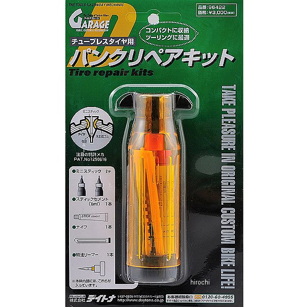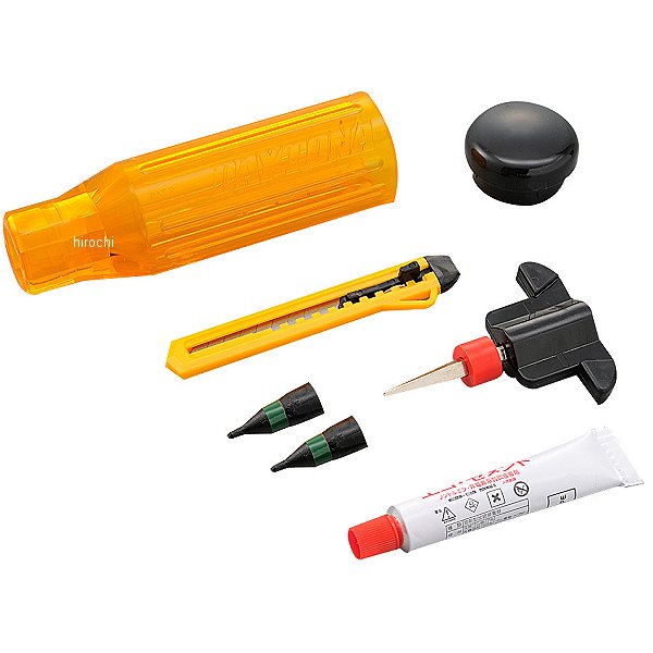 デイトナ パンク修理キット チューブレスタイプチューブレスタイプ各部品を本体ボディにコンパクト収納できるハンディタイプ。スティック内に埋設された特殊弾頭により、小さな傷穴にスティックが楽に挿入でき、戻り止め効果で走行中の脱落もなし。修理後は走行熱によりスティックの未加硫ゴムがタイヤと一体化し完全なシール効果を発揮。