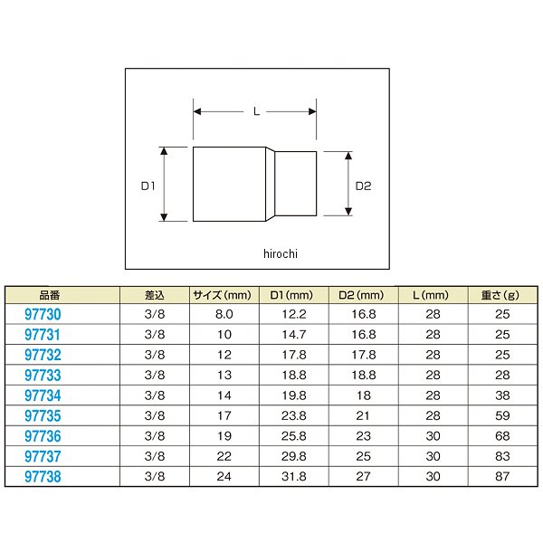 デイトナ 六角ソケット(ショート)6ポイントサイズ:12mm差込:3/8インチD1:17.8mm x D2:17.8mm x L:28mm重さ:25g