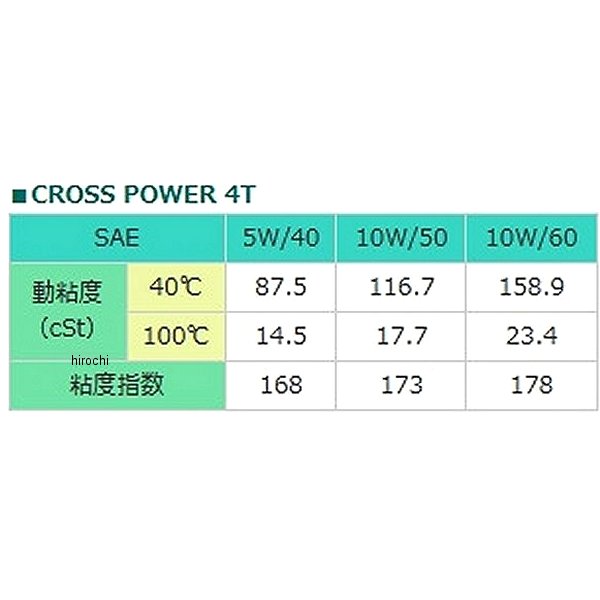 モトレックス MOTOREX CROSS POWER 4T粘度:10W-50用途:4サイクル用エンジンオイル容量:4L基油:100%化学合成油JASO:MAAPI:SL最新技術で開発された4ストオフロード車に最適湿式多板クラッチに理想的なマッチングを見せます。KTMほか、多くのモトクロスレーシングチームとの共同開発で誕生しました。摩擦による抵抗が少なく、パワーロスを低減低温から高温まであらゆる温度領域で安定した性能を発揮低温時の潤滑性が優れているので、暖機運転を短縮できます。また、より高温時でも安定したオイル性能を発揮スロットルワークの激しい4サイクルオフロード車用に開発されたオイル。KTM 4サイクル車の指定オイルです。ポリタンクからディスペンサー付バッグへリニューアル容器がエコになりました。従来のポリタンク (25L)から、ディスペンサー付バッグ (20L)に変更して、プラスチック素材を最小限に抑えました。環境にやさしく、空容器はコンパクトになるため場所も取りません。