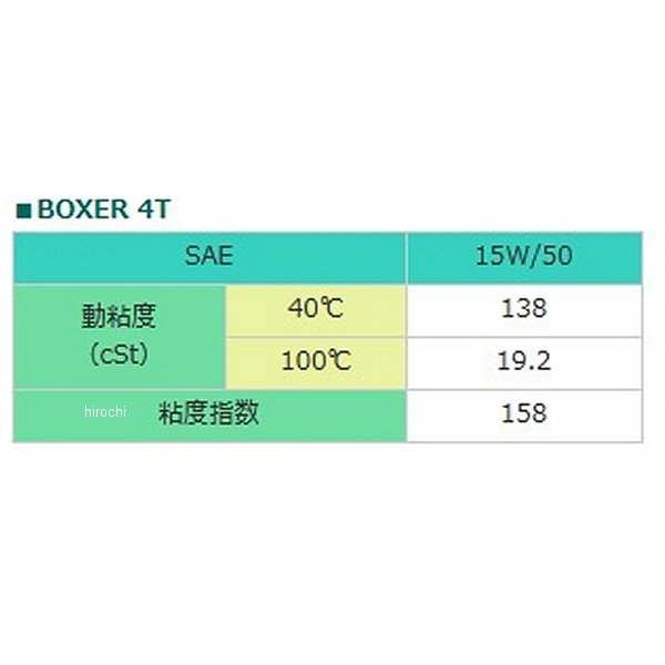 モトレックス MOTOREX BOXER 4T粘度:15W-50用途:4サイクル用エンジンオイル容量:1L基油:鉱物油JASO:MAAPI:SL【素材】・外装箱:段ボール・容器/ノズル:プラスチック4バルブボクサーエンジン専用オイルAC SCHNITZER共同開発鉱物油をベースにMOTOREX独自の分子変換製法で、100%化学合成に近いパフォーマンスを発揮するエンジンオイル新開発の潤滑成分はエンジンオイルの消費を抑え、高い耐熱性を発揮。ガスケット、シール類への攻撃性も低く抑えています。ポリタンクからディスペンサー付バッグへリニューアル容器がエコになりました。従来のポリタンク (25L)から、ディスペンサー付バッグ (20L)に変更して、プラスチック素材を最小限に抑えました。環境にやさしく、空容器はコンパクトになるため場所も取りません。