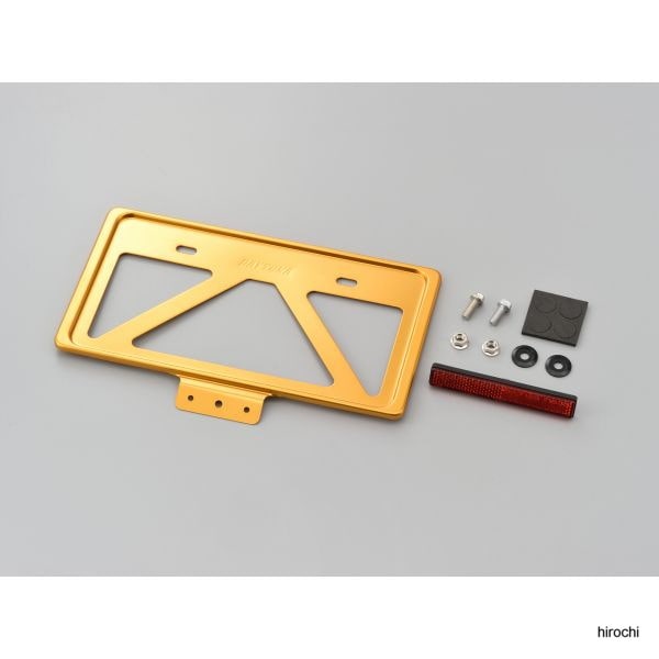デイトナ ナンバープレートホルダーL リフレクター付き ゴールド振動によるナンバープレートのひび割れや破損を予防します。1mm厚アルミ材を大胆に肉抜きすることで必要な強度を保ちつつ極限まで軽量化しました。板厚が薄いのでフチのプレスラインもシャープになりスタイリッシュ。ナンバープレートのドレスアップに最適です。 ■新保安基準適合【付属品】アルミナンバープレート×1リフレクター×1フランジスペーサー×2個フランジボルト(M6×15mm)×2個フランジナット(M6)×2個ウレタンスポンジ×4個 ※取付工具は付属しません。※必ず取り付けするナンバープレートの形状をご確認ください。※取り付けするフェンダーの形状によっては装着できない場合があります。※プレート自体に防振効果はありません。※付属のボルトで長さが足りない場合は、車両に合わせて適切な長さのボルトを別途ご用意ください。