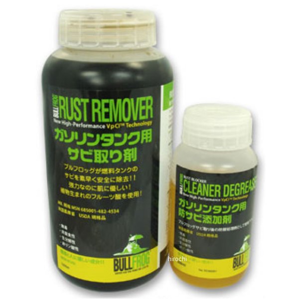 99901 ガッツクローム ブルフロッグ ガソリンタンク用サビ取り剤燃料タンクのサビを素早く安全に除去。強力なのに肌にやさしい。使用後の溶剤もゴミを取り除けば繰り返し使用が可能。捨てるときも一般的な生活排水と同じように流せます。【効果】短い施工時間…頑固なサビも6時間で落ちます繰り返し使用可能…使えば使うほどお得簡単な処理…環境に配慮したフルーツ酸で取り扱いが簡単内容量:1000ml (防錆コート剤200mlも付属)