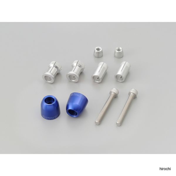 デイトナ アルミビレットバーエンド ラウンドプラグタイプ 青飽きのこないシンプルなデザイン。2種類のアルミ製取付アタッチメントが付属しハンドル内径Φ14~Φ19まで幅広く対応します。転倒の際にはブレーキまたはクラッチレバーの破損を低減。転倒の際には取付ボルトが破損しにくいデザインです。 カラー:ブルー タイプ:ラウンドプラグ アルミ削り出しアルマイト仕上げ外径:Φ22 全長:21mm 片側重量:約34gハンドル内径:Φ14~Φ19対応 デイトナロゴ入り ※ホンダ、ヤマハの一部の純正ハンドルに装着する場合は、インナーウエイトの取り外しが必要です。※一部のスズキ車純正ハンドルに対応しています。※スロットル側への装着の際は、グリップと接触しないように位置調整を行なってください。※アルマイト仕上げの商品は環境や使用状況により早期退色が発生する可能性があります。