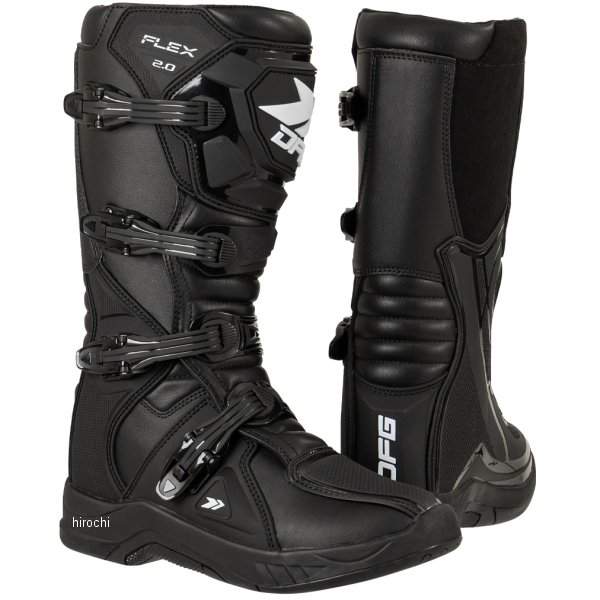ディーエフジー DFG フレックス ブーツ 2.0カラー:ブラックサイズ:25.5cmオフロード初心者~中級者に最適な、フラットソール モトクロスブーツ。ブーツ本体は操作性を損なわずに高い強度を確保し、障害物や転倒した際にしっかり足を保護する。軽くて柔らかいため、これからオフロードを始める初心者でも使いやすい。本格的なモトクロスコースから林道ツーリングまで幅広く使用可能。日本人の幅広・甲高な足の形状に合わせたジャパンフィット設計により、快適なフィット感を実現。重量:約1450g(26.5㎝/片足重量)ブーツ甲幅:ワイド設計(4E相当)ニーシンガード/ニーブレース対応素材:【甲部分】合成皮革・ポリウレタン(TPU)【 裏地】ポリエステル・スパンデックス【 ソール】合成樹脂(ラバー)【ご注意ください】・履き始めは、まだ生地が硬い状態のためブーツが硬く感じます。安全性を確保するためにも、ブーツを柔らかくするために、必ず「ブーツの慣らし作業」を行ってください。・オフロードブーツはオンロードブーツと比べてつま先に厚みがあるため、バイクの車種によっては純正のシフトレバーの位置ではシフトチェンジ(シフトアップ)がやりづらい場合がございます。その場合、シフトレバーの高さを1段階上げるなどの車体側の調整を行ってください。・オフロードコースや林道を走行する場合は、安全面からニーシンガードなどの膝や脛を守るプロテクターとセットで着用することを推奨いたします。・オフロードレーサーなどのキックペダルがある車両の場合、キックスタート時に過度に荷重をかけるとソールが破損する恐れがありますのでご注意ください。・ブーツの上から2番目のストラップの長さが合わない場合、上から2番目と3番目のストラップを付け替えることでストラップの長さ調整をすることが可能です。・ご使用になる前にブーツが安全な状態であることを確かめてご使用ください。使用頻度によってはバックルのボルトが緩んでくる場合がございます。ボルトが緩い場合はボルトの増し締めやネジロック剤などを使用してください。