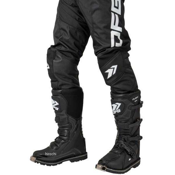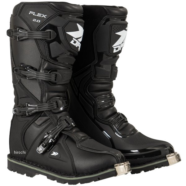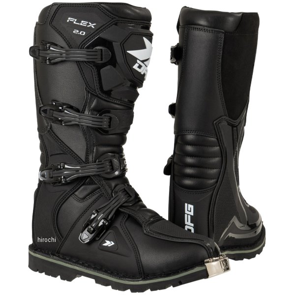 ディーエフジー DFG フレックス ブーツ オフロード 2.0カラー:ブラックサイズ:25.0cmオフロード初心者~中級者に最適な、ブロックソール エンデューロブーツ。ブーツ本体は操作性を損なわずに高い強度を確保し、障害物や転倒した際にしっかり足を保護する。軽くて柔らかいため、これからオフロードを始める初心者でも使いやすい。本格的なオフロードコースから林道ツーリングまで幅広く使用可能。日本人の幅広・甲高な足の形状に合わせたジャパンフィット設計により、快適なフィット感を実現。重量:約1500g(26.5㎝/片足重量)ブーツ甲幅:ワイド設計(4E相当)ニーシンガード/ニーブレース対応素材:【甲部分】合成皮革・ポリウレタン(TPU)【 裏地】ポリエステル・スパンデックス【 ソール】合成樹脂(ラバー)【ご注意ください】・履き始めは、まだ生地が硬い状態のためブーツが硬く感じます。安全性を確保するためにも、ブーツを柔らかくするために、必ず「ブーツの慣らし作業」を行ってください。・オフロードブーツはオンロードブーツと比べてつま先に厚みがあるため、バイクの車種によっては純正のシフトレバーの位置ではシフトチェンジ(シフトアップ)がやりづらい場合がございます。その場合、シフトレバーの高さを1段階上げるなどの車体側の調整を行ってください。・オフロードコースや林道を走行する場合は、安全面からニーシンガードなどの膝や脛を守るプロテクターとセットで着用することを推奨いたします。・オフロードレーサーなどのキックペダルがある車両の場合、キックスタート時に過度に荷重をかけるとソールが破損する恐れがありますのでご注意ください。・ブーツの上から2番目のストラップの長さが合わない場合、上から2番目と3番目のストラップを付け替えることでストラップの長さ調整をすることが可能です。・ご使用になる前にブーツが安全な状態であることを確かめてご使用ください。使用頻度によってはバックルのボルトが緩んでくる場合がございます。ボルトが緩い場合はボルトの増し締めやネジロック剤などを使用してください。