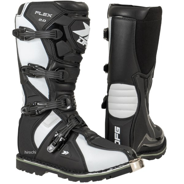 ディーエフジー DFG フレックス ブーツ オフロード 2.0カラー:ブラック/ホワイトサイズ:24.0cmオフロード初心者~中級者に最適な、ブロックソール エンデューロブーツ。ブーツ本体は操作性を損なわずに高い強度を確保し、障害物や転倒した際にしっかり足を保護する。軽くて柔らかいため、これからオフロードを始める初心者でも使いやすい。本格的なオフロードコースから林道ツーリングまで幅広く使用可能。日本人の幅広・甲高な足の形状に合わせたジャパンフィット設計により、快適なフィット感を実現。重量:約1500g(26.5㎝/片足重量)ブーツ甲幅:ワイド設計(4E相当)ニーシンガード/ニーブレース対応素材:【甲部分】合成皮革・ポリウレタン(TPU)【 裏地】ポリエステル・スパンデックス【 ソール】合成樹脂(ラバー)【ご注意ください】・履き始めは、まだ生地が硬い状態のためブーツが硬く感じます。安全性を確保するためにも、ブーツを柔らかくするために、必ず「ブーツの慣らし作業」を行ってください。・オフロードブーツはオンロードブーツと比べてつま先に厚みがあるため、バイクの車種によっては純正のシフトレバーの位置ではシフトチェンジ(シフトアップ)がやりづらい場合がございます。その場合、シフトレバーの高さを1段階上げるなどの車体側の調整を行ってください。・オフロードコースや林道を走行する場合は、安全面からニーシンガードなどの膝や脛を守るプロテクターとセットで着用することを推奨いたします。・オフロードレーサーなどのキックペダルがある車両の場合、キックスタート時に過度に荷重をかけるとソールが破損する恐れがありますのでご注意ください。・ブーツの上から2番目のストラップの長さが合わない場合、上から2番目と3番目のストラップを付け替えることでストラップの長さ調整をすることが可能です。・ご使用になる前にブーツが安全な状態であることを確かめてご使用ください。使用頻度によってはバックルのボルトが緩んでくる場合がございます。ボルトが緩い場合はボルトの増し締めやネジロック剤などを使用してください。