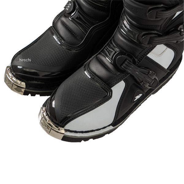 ディーエフジー DFG フレックス ブーツ オフロード 2.0カラー:ブラック/ホワイトサイズ:24.5cmオフロード初心者~中級者に最適な、ブロックソール エンデューロブーツ。ブーツ本体は操作性を損なわずに高い強度を確保し、障害物や転倒した際にしっかり足を保護する。軽くて柔らかいため、これからオフロードを始める初心者でも使いやすい。本格的なオフロードコースから林道ツーリングまで幅広く使用可能。日本人の幅広・甲高な足の形状に合わせたジャパンフィット設計により、快適なフィット感を実現。重量:約1500g(26.5㎝/片足重量)ブーツ甲幅:ワイド設計(4E相当)ニーシンガード/ニーブレース対応素材:【甲部分】合成皮革・ポリウレタン(TPU)【 裏地】ポリエステル・スパンデックス【 ソール】合成樹脂(ラバー)【ご注意ください】・履き始めは、まだ生地が硬い状態のためブーツが硬く感じます。安全性を確保するためにも、ブーツを柔らかくするために、必ず「ブーツの慣らし作業」を行ってください。・オフロードブーツはオンロードブーツと比べてつま先に厚みがあるため、バイクの車種によっては純正のシフトレバーの位置ではシフトチェンジ(シフトアップ)がやりづらい場合がございます。その場合、シフトレバーの高さを1段階上げるなどの車体側の調整を行ってください。・オフロードコースや林道を走行する場合は、安全面からニーシンガードなどの膝や脛を守るプロテクターとセットで着用することを推奨いたします。・オフロードレーサーなどのキックペダルがある車両の場合、キックスタート時に過度に荷重をかけるとソールが破損する恐れがありますのでご注意ください。・ブーツの上から2番目のストラップの長さが合わない場合、上から2番目と3番目のストラップを付け替えることでストラップの長さ調整をすることが可能です。・ご使用になる前にブーツが安全な状態であることを確かめてご使用ください。使用頻度によってはバックルのボルトが緩んでくる場合がございます。ボルトが緩い場合はボルトの増し締めやネジロック剤などを使用してください。