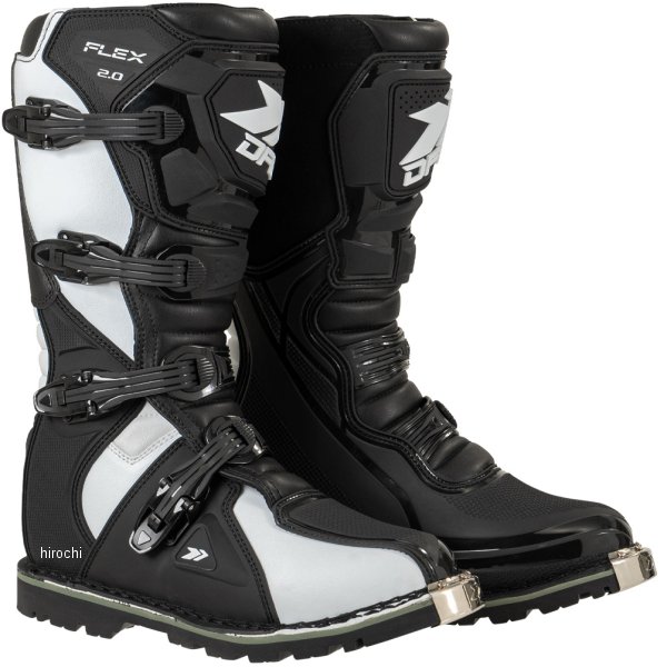 ディーエフジー DFG フレックス ブーツ オフロード 2.0カラー:ブラック/ホワイトサイズ:28.0cmオフロード初心者~中級者に最適な、ブロックソール エンデューロブーツ。ブーツ本体は操作性を損なわずに高い強度を確保し、障害物や転倒した際にしっかり足を保護する。軽くて柔らかいため、これからオフロードを始める初心者でも使いやすい。本格的なオフロードコースから林道ツーリングまで幅広く使用可能。日本人の幅広・甲高な足の形状に合わせたジャパンフィット設計により、快適なフィット感を実現。重量:約1500g(26.5㎝/片足重量)ブーツ甲幅:ワイド設計(4E相当)ニーシンガード/ニーブレース対応素材:【甲部分】合成皮革・ポリウレタン(TPU)【 裏地】ポリエステル・スパンデックス【 ソール】合成樹脂(ラバー)【ご注意ください】・履き始めは、まだ生地が硬い状態のためブーツが硬く感じます。安全性を確保するためにも、ブーツを柔らかくするために、必ず「ブーツの慣らし作業」を行ってください。・オフロードブーツはオンロードブーツと比べてつま先に厚みがあるため、バイクの車種によっては純正のシフトレバーの位置ではシフトチェンジ(シフトアップ)がやりづらい場合がございます。その場合、シフトレバーの高さを1段階上げるなどの車体側の調整を行ってください。・オフロードコースや林道を走行する場合は、安全面からニーシンガードなどの膝や脛を守るプロテクターとセットで着用することを推奨いたします。・オフロードレーサーなどのキックペダルがある車両の場合、キックスタート時に過度に荷重をかけるとソールが破損する恐れがありますのでご注意ください。・ブーツの上から2番目のストラップの長さが合わない場合、上から2番目と3番目のストラップを付け替えることでストラップの長さ調整をすることが可能です。・ご使用になる前にブーツが安全な状態であることを確かめてご使用ください。使用頻度によってはバックルのボルトが緩んでくる場合がございます。ボルトが緩い場合はボルトの増し締めやネジロック剤などを使用してください。