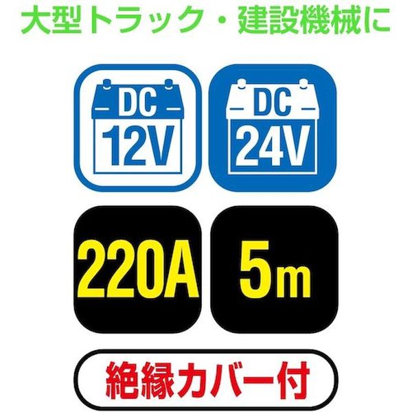 ・大型トラック・建設機械に最適なブースターケーブルです。・絶縁カバー付きです。・バッテリーのトラブルにより、エンジン始動に。・入力電圧(V):12/24・ケーブル長(m):5・ケーブル太さ([[MM2]]):22.2・電流(A):220・生産国 中国・JANコード 4906918083523・質量 4kg・コード:338-3723 ・品目:BC225