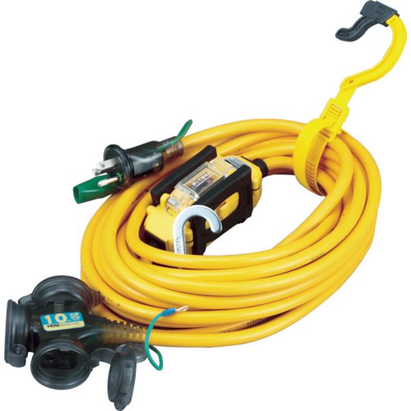 ・漏電・使いすぎをコンセントの手前で遮断できる漏電遮断器を簡単に設置できます。・完全防雨構造なので、雨中でも安心して使えます。・衝撃に強いゴム製プロテクターです。・吊り下げて使える便利なフック付です。・防雨型2P/2P接地付プラグのどちらでもすき間なくはまる兼用コンセントを採用しています。・電源と機器の間に取り付け漏電・使い過ぎによる事故を未然に防ぐ後付け漏電遮断器付延長コード。現場の元電源保護に最適・改修工事・リフォーム工事、清掃中などに元電源を落としてしまうトラブルを回避に。・色:イエロー・電線種:ソフトVCT・電線仕様長さ(m):10・電線仕様太さ([[MM2]]):2.0・電線仕様芯数(C):3・コンセント仕様定格:2P・15A・125V アース付・コンセント仕様形状:[[三相1]]・コンセント仕様個数:3・接地アース:○・漏電遮断器仕様:漏電過負荷短絡保護兼用・AC100V・電線種別:ソフトVCT・防雨型コンセントキャップ・ケーブル:軟質塩化ビニール・ブレーカーカバー:ABS・フック:SPC・フックホルダー:P.P・生産国 日本・JANコード 4930510419657・質量 2kg・コード:360-1480 ・品目:BFX103KC
