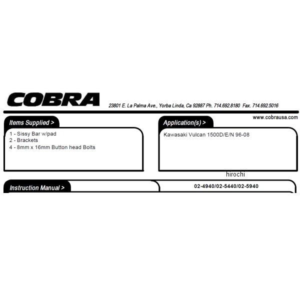 コブラ COBRA シーシーバー スタンダード00年-02年 カワサキ VN1500N Vulcan 1500 Classic FI 96年-08年 カワサキ VN 1500 Vulcan Classic 96年-99年、03年-08年 カワサキ VN 1500 N Vulcan Classic Fi 高さ:17インチ(432mm)付属:パッド、ブラケット、ボルト類・乗車に不可欠なアクセサリー・乗客の快適性と安全性を高め、荷物の持ち運びにも役立ちます。(荷物ラックは別途購入が必要)・クロムメッキの長方形のバースチール製。・標準、ショート、ミニバージョンがあります。・頑丈なマウントブラケットとフリーダムパッドが付属。・アメリカ製。