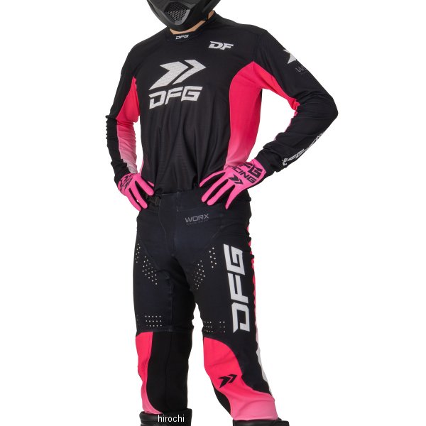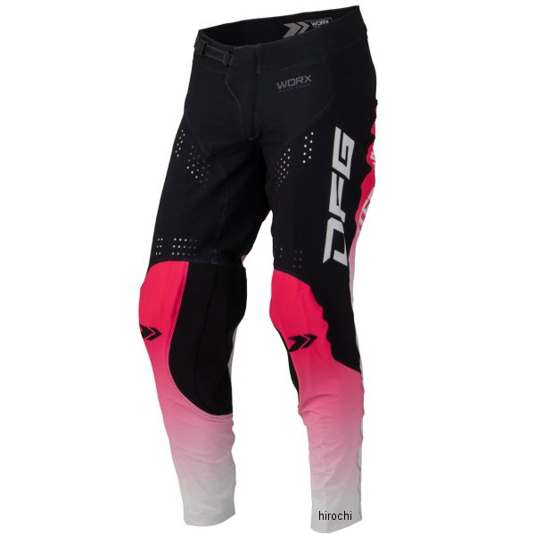 ディーエフジー DFG ワークス パンツ チャンプサイズ:32カラー:ブラック/ピンク素材:ポリエステル、ケブラーアーマーテックス【仕様説明】プロライダーの要望によって誕生したレーシングモトクロスパンツ。軽量かつ縦横4方向に伸縮するストレッチ生地を採用。新たにサイズ調整がしやすいアジャスターバックルを採用。幅広なウエストパネルを確実に体にフィットさせ、前傾姿勢で肘を上げて胸を張る「アタックポジション」を想定したパターンを採用。両膝内側にはエンジンやエキパイからの熱に耐え、耐摩耗性と引裂き強度に優れる、ケブラーアーマーテックスを採用。熱がこもりやすい太もも内側部分には、大型ベントホールを配置。スポーツライディングによるライダーのオーバーヒートを、積極的に冷却。ライダーに余計なストレスを与えず、体力の消耗を防ぎ、常に攻め続ける事ができるハイパフォーマンス仕様。
