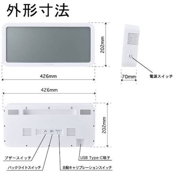 ・大きな表示で見やすさ抜群、発光&ブザーで換気のタイミングをお知らせする、超大型液晶の[[CO2]]モニターです。・光音響方式(PAS式)センサーで[[CO2]]を正確に感知します。・経済産業省が「二酸化炭素濃度測定器の選定等に関するガイドライン」にて推奨する、[[CO2]]が赤外線の波長に反応することを利用した次世代の光音響方式センサーを使用しています。・[[CO2]]濃度を「見える化」し、人が集まる場所で大活躍します。・密閉・密室になりやすい室内環境の改善に快適です。・オフィスの会議室・学校の教室・病院や施設・幼稚園や保育園など、人が集まりやすく、閉鎖的な室内環境の改善に効果的です。・また、マグネット・壁掛・据え置きとお好きな設置方法をお選びいただけます。・※本製品は製品周辺の[[CO2]]濃度を検出、表示します。・発光&ブザーで換気のタイミングをお知らせします。・換気のタイミングを、以下の3段階でお知らせします。・人の密集や空気のよどみをお知らせ用に・対象ガス:二酸化炭素([[CO2]])・幅(mm):426・奥行(mm):70・高さ(mm):202・測定範囲(ppm):400~5000・分解能(ppm):1・色:白・[[CO2]]表示誤差:±(5%+40ppm)・[[CO2]]検出分解能:1ppm・温度温度検出範囲 : -9℃~50℃・温度表示誤差 : ±1℃(0℃~40℃)・±2℃(-9℃~0℃&40℃~50℃)・湿度湿度検出範囲 : 20%~95%・ABS樹脂、ガラス・ACアダプタ・USBケーブル4m(Type-A/Type-C)・取扱説明書(保証書付き)・生産国 中国・JANコード 4971660778843・質量 1520g・コード:402-4050 ・品目:CD100W