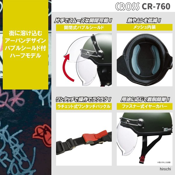 CR-761 リード工業 ハーフヘルメット クロス バブルシールド付きサイズ:LLカラー:マットグリーン125cc以下対応【仕様説明】ハーフヘルメットに開閉式バブルシールドを装備したモデル。開閉式バブルシールドは、ハードコート、UVカット仕様。イヤーカバーはファスナー式で着脱可能。着脱、調整が容易なラチェット式バックルを装備。ワンタッチで操作できるので、あご紐脱着のわずらしさを軽減します。【規格】SG/PSC【届出事業者】株式会社リード工業【検査機関】一般財団法人製品安全協会