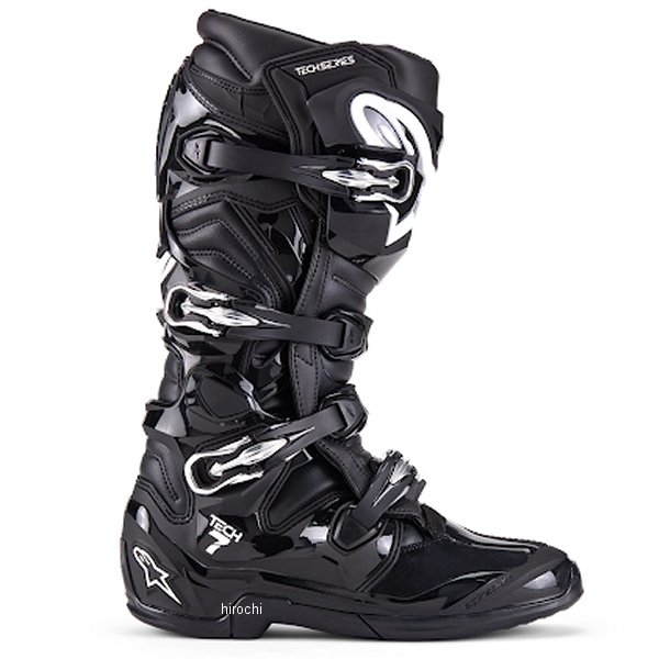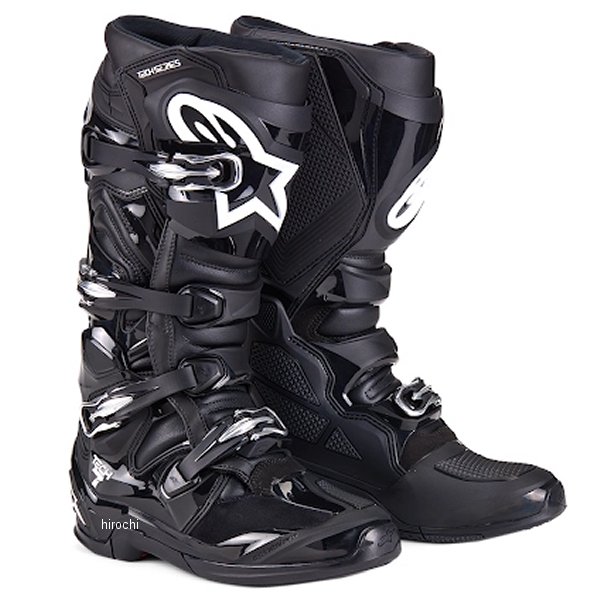 アルパインスターズ ブーツ TECH7サイズ:8(26.5cm)カラー:ブラック革新的な素材、技術、デザインを詰め込んだTech 7は、オフロードでの優れたパフォーマンスを発揮するために全面的に改良。軽量化、快適性、保護性能をさらに向上させながら、バイクとの優れたフィーリングを提供。・ブーツの主な屈曲部は、内側と外側の足首に薄型のピボットシステムを採用し、優れた自由な動きとライダーの快適さを提供。・足部分のTPU製シェルはシフターエリアに革新的なデザインを採用。左右の足に専用設計を施し、メタルシャンクで強化。つま先部分は衝撃や摩擦に対する耐性を強化。・足首とすね部分には衝撃吸収パッドを配置し、衝撃吸収力を向上。・ソールには、フットペグエリアに埋め込まれた革新的な摩耗限界インジケーターを搭載。すり減ると赤い層が現れソール交換のタイミングを知らせる。・クローザーシステムには、ポリマーバックルとアルミフレームを採用し、自己調整機能とクイックリリース機能で個々のフィット感に合わせたカスタマイズが可能。・バックル受け部は自己調整設計で、ストラップの回転を防ぎながら安全なフィット感を保証。・内側パネルはTPU製で、バイクとの接触時に最大のグリップを提供し、耐熱性と耐摩耗性を向上させるラバーインサートを配置。・アキレス腱を保護するため、足首後部にTPUバックブリッジを追加。・EN 13634:2017に基づくCE認証を取得。