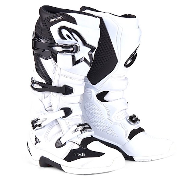 アルパインスターズ ブーツ TECH7サイズ:9(27.5cm)カラー:ホワイト/ブラック革新的な素材、技術、デザインを詰め込んだTech 7は、オフロードでの優れたパフォーマンスを発揮するために全面的に改良。軽量化、快適性、保護性能をさらに向上させながら、バイクとの優れたフィーリングを提供。・ブーツの主な屈曲部は、内側と外側の足首に薄型のピボットシステムを採用し、優れた自由な動きとライダーの快適さを提供。・足部分のTPU製シェルはシフターエリアに革新的なデザインを採用。左右の足に専用設計を施し、メタルシャンクで強化。つま先部分は衝撃や摩擦に対する耐性を強化。・足首とすね部分には衝撃吸収パッドを配置し、衝撃吸収力を向上。・ソールには、フットペグエリアに埋め込まれた革新的な摩耗限界インジケーターを搭載。すり減ると赤い層が現れソール交換のタイミングを知らせる。・クローザーシステムには、ポリマーバックルとアルミフレームを採用し、自己調整機能とクイックリリース機能で個々のフィット感に合わせたカスタマイズが可能。・バックル受け部は自己調整設計で、ストラップの回転を防ぎながら安全なフィット感を保証。・内側パネルはTPU製で、バイクとの接触時に最大のグリップを提供し、耐熱性と耐摩耗性を向上させるラバーインサートを配置。・アキレス腱を保護するため、足首後部にTPUバックブリッジを追加。・EN 13634:2017に基づくCE認証を取得。