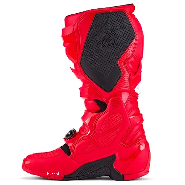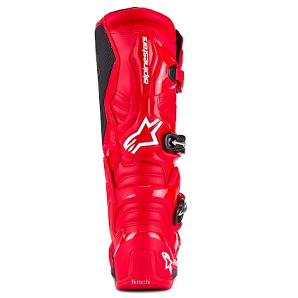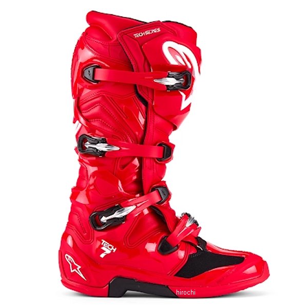 アルパインスターズ ブーツ TECH7サイズ:7(25.5cm)カラー:ブライトレッド革新的な素材、技術、デザインを詰め込んだTech 7は、オフロードでの優れたパフォーマンスを発揮するために全面的に改良。軽量化、快適性、保護性能をさらに向上させながら、バイクとの優れたフィーリングを提供。・ブーツの主な屈曲部は、内側と外側の足首に薄型のピボットシステムを採用し、優れた自由な動きとライダーの快適さを提供。・足部分のTPU製シェルはシフターエリアに革新的なデザインを採用。左右の足に専用設計を施し、メタルシャンクで強化。つま先部分は衝撃や摩擦に対する耐性を強化。・足首とすね部分には衝撃吸収パッドを配置し、衝撃吸収力を向上。・ソールには、フットペグエリアに埋め込まれた革新的な摩耗限界インジケーターを搭載。すり減ると赤い層が現れソール交換のタイミングを知らせる。・クローザーシステムには、ポリマーバックルとアルミフレームを採用し、自己調整機能とクイックリリース機能で個々のフィット感に合わせたカスタマイズが可能。・バックル受け部は自己調整設計で、ストラップの回転を防ぎながら安全なフィット感を保証。・内側パネルはTPU製で、バイクとの接触時に最大のグリップを提供し、耐熱性と耐摩耗性を向上させるラバーインサートを配置。・アキレス腱を保護するため、足首後部にTPUバックブリッジを追加。・EN 13634:2017に基づくCE認証を取得。