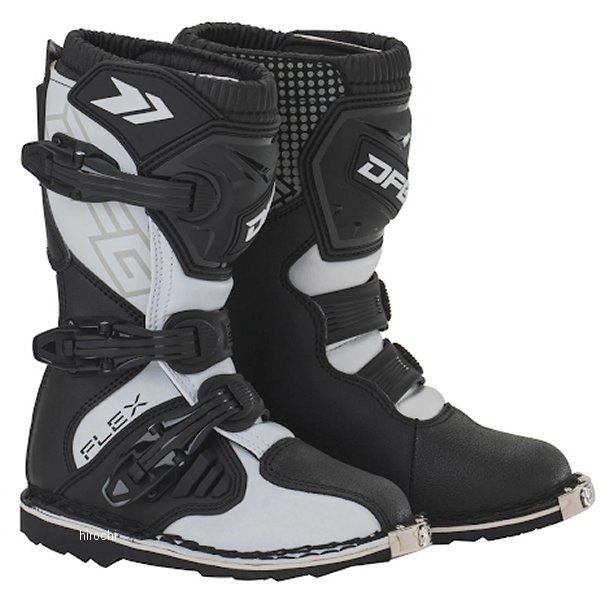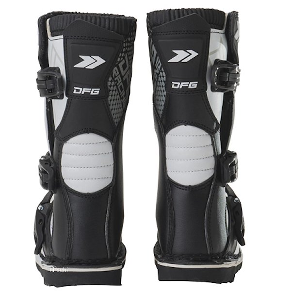 ディーエフジー DFG フレックス ブーツ キッズサイズ:19.0cmカラー:ブラック/ホワイト・甲部分素材:合成皮革、ポリウレタン(TPU)・裏地分素材:ポリエステルメッシュ、スパンデックス・アウトソール素材:合成樹脂(ラバー)【仕様説明】キッズライダーに最適な、コストパフォーマンスに優れるモトクロスブーツ。ブーツ本体は操作性を損なわずに高い強度を確保。転倒した際や障害物等から足を保護。キッズの足に合わせた専用設計で、快適なフィット感を実現。本格的なモトクロス走行に対応。・耐摩耗性、耐油性に優れたフラットタイプのラバーソールは、スムーズなライディングコントロールを実現。・クイックバックルにより、簡単で確実な固定とスムーズな脱ぎ履きが可能。・ブーツストラップは細かな締め付け調整ができる。・障害物や飛び石が直接バックルに当たり破損するのを防ぐ、バックルガードを装備。・車体と接触する足首周辺にグリップレザーを使用。ライディングによるブーツ本体の摩耗を防ぎつつ、強度を確保することで足首のねじれ損傷を防止。・インナーには通気性と吸汗性に優れる3Dメッシュを使用。また、足首周辺に肉厚なクッション材を内蔵し、衝撃吸収と柔らかな履き心地を実現。