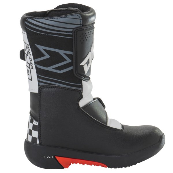 ディーエフジー DFG ホッパー ブーツサイズ:16.0cmカラー:ブラック/ホワイト・甲部分素材:合成皮革、ポリウレタン(TPU)・裏地分素材:ポリエステルメッシュ、スパンデックス・アウトソール素材:合成樹脂(ラバー)【仕様説明】エンジンバイク・電動バイクに乗り始めるキッズライダーに、最適なモトクロスブーツ。ブーツ本体は操作性を損なわずに高い強度を確保。転倒した際や障害物等から足を保護。キッズの足に合わせた専用設計で、快適なフィット感を実現。本格的なモトクロス走行に対応。・耐久性に優れた厚みのあるラバーソールを使用。車体のステップと滑りにくく、土の上でもしっかりグリップする。・クイックバックルにより、簡単で確実な固定とスムーズな脱ぎ履きが可能。ブーツストラップは細かな締め付け調整ができる。・通常の状態では柔らかく、高速衝突時には衝撃を瞬時に吸収・分散する特殊なプロテクター(ESA)を足首部分に内蔵。走行時・転倒時に最大限の保護力を発揮し、足首をしっかり守る。・足の甲部分に滑り止めグリップレザーを配置し、確実なシフトレバー操作が可能。つま先部分に芯材を内蔵し、走行中の障害物などから足を保護する。・ブーツ内側に耐熱性、耐久性に優れ、滑りにくい本革スウェードを採用。エンジンやエキゾーストパイプの熱からブーツを保護し、フラット形状でスムーズなライディングにも貢献。・車体と接触する足首内側に滑り止めグリップレザーを配置。車体ホールド時のグリップ効果を発揮し、ライディングによるブーツ本体の摩耗を防ぐ。・クッション性のある内装は成長期のキッズの足をやさしくサポート