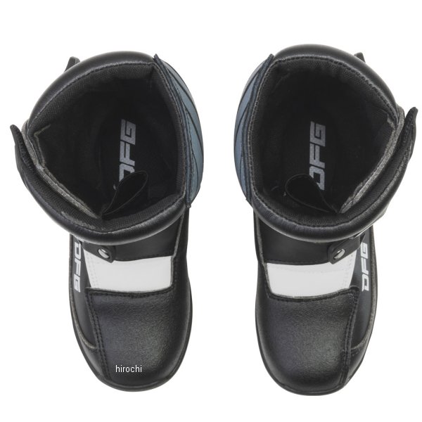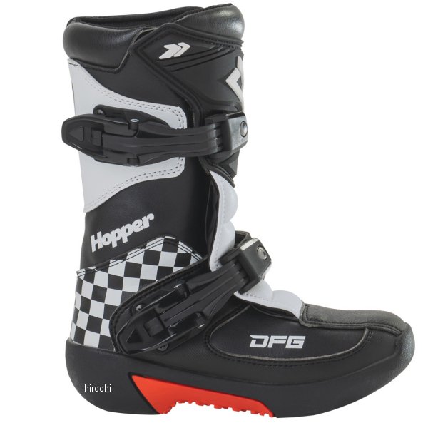 ディーエフジー DFG ホッパー ブーツサイズ:18.0cmカラー:ブラック/ホワイト・甲部分素材:合成皮革、ポリウレタン(TPU)・裏地分素材:ポリエステルメッシュ、スパンデックス・アウトソール素材:合成樹脂(ラバー)【仕様説明】エンジンバイク・電動バイクに乗り始めるキッズライダーに、最適なモトクロスブーツ。ブーツ本体は操作性を損なわずに高い強度を確保。転倒した際や障害物等から足を保護。キッズの足に合わせた専用設計で、快適なフィット感を実現。本格的なモトクロス走行に対応。・耐久性に優れた厚みのあるラバーソールを使用。車体のステップと滑りにくく、土の上でもしっかりグリップする。・クイックバックルにより、簡単で確実な固定とスムーズな脱ぎ履きが可能。ブーツストラップは細かな締め付け調整ができる。・通常の状態では柔らかく、高速衝突時には衝撃を瞬時に吸収・分散する特殊なプロテクター(ESA)を足首部分に内蔵。走行時・転倒時に最大限の保護力を発揮し、足首をしっかり守る。・足の甲部分に滑り止めグリップレザーを配置し、確実なシフトレバー操作が可能。つま先部分に芯材を内蔵し、走行中の障害物などから足を保護する。・ブーツ内側に耐熱性、耐久性に優れ、滑りにくい本革スウェードを採用。エンジンやエキゾーストパイプの熱からブーツを保護し、フラット形状でスムーズなライディングにも貢献。・車体と接触する足首内側に滑り止めグリップレザーを配置。車体ホールド時のグリップ効果を発揮し、ライディングによるブーツ本体の摩耗を防ぐ。・クッション性のある内装は成長期のキッズの足をやさしくサポート