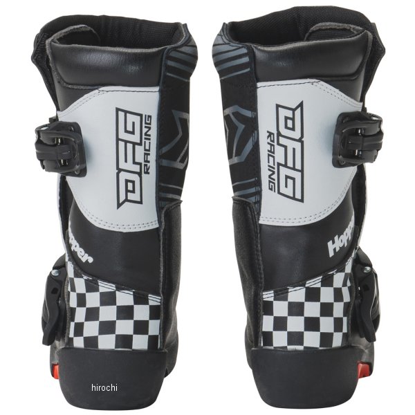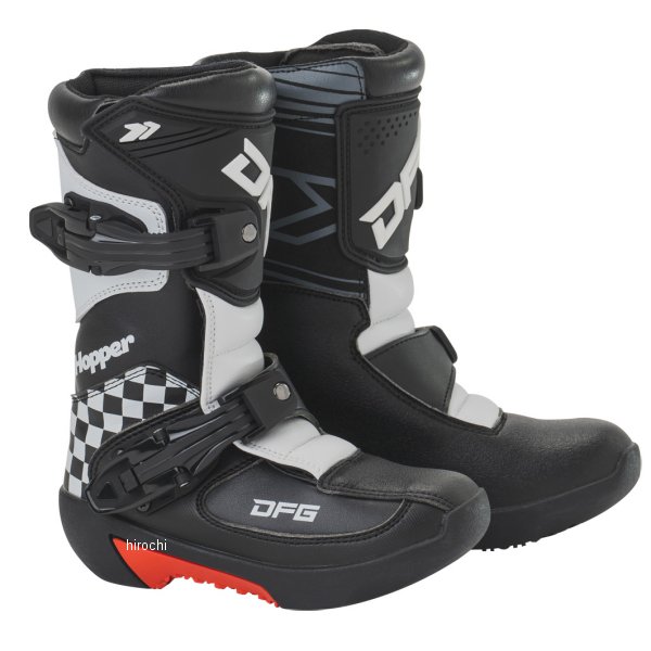 ディーエフジー DFG ホッパー ブーツサイズ:19.0cmカラー:ブラック/ホワイト・甲部分素材:合成皮革、ポリウレタン(TPU)・裏地分素材:ポリエステルメッシュ、スパンデックス・アウトソール素材:合成樹脂(ラバー)【仕様説明】エンジンバイク・電動バイクに乗り始めるキッズライダーに、最適なモトクロスブーツ。ブーツ本体は操作性を損なわずに高い強度を確保。転倒した際や障害物等から足を保護。キッズの足に合わせた専用設計で、快適なフィット感を実現。本格的なモトクロス走行に対応。・耐久性に優れた厚みのあるラバーソールを使用。車体のステップと滑りにくく、土の上でもしっかりグリップする。・クイックバックルにより、簡単で確実な固定とスムーズな脱ぎ履きが可能。ブーツストラップは細かな締め付け調整ができる。・通常の状態では柔らかく、高速衝突時には衝撃を瞬時に吸収・分散する特殊なプロテクター(ESA)を足首部分に内蔵。走行時・転倒時に最大限の保護力を発揮し、足首をしっかり守る。・足の甲部分に滑り止めグリップレザーを配置し、確実なシフトレバー操作が可能。つま先部分に芯材を内蔵し、走行中の障害物などから足を保護する。・ブーツ内側に耐熱性、耐久性に優れ、滑りにくい本革スウェードを採用。エンジンやエキゾーストパイプの熱からブーツを保護し、フラット形状でスムーズなライディングにも貢献。・車体と接触する足首内側に滑り止めグリップレザーを配置。車体ホールド時のグリップ効果を発揮し、ライディングによるブーツ本体の摩耗を防ぐ。・クッション性のある内装は成長期のキッズの足をやさしくサポート