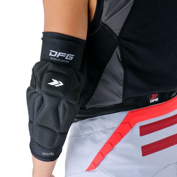 ディーエフジー DFG プロテクター シールドレイヤー エルボーガードサイズ:S-M左右セット素材:ポリエステル(スリーブ)/ポリエチレン(パッド)前モデルより防御性を上げ、更なる「軽さ」、「動きやすさ」を徹底追求したコンパクト設計肘パッド。厚みのあるパットながらライディング操作を妨げる事なく確かなプロテクションを発揮。伸縮のあるストレッチ素材で腕の動きに柔軟に対応するスリーブ形状&軽量設計。ユースやレディースライダーの腕サイズでもズレにくく様々な体系のライダーにストレスなくフィット。肘の動きを妨げない設計により、インナーレイヤー/アウタースタイルとライダーの好みで装着可能。ポケットやポーチなどにコンパクトに収納できるため、ツーリング時にもおすすめ。