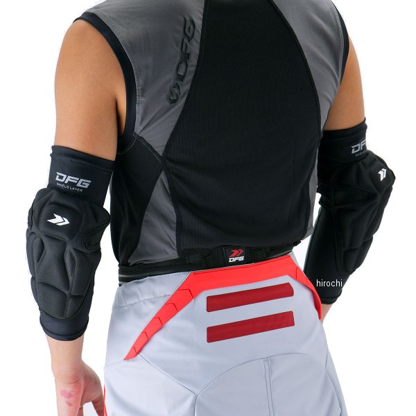 ディーエフジー DFG プロテクター シールドレイヤー エルボーガードサイズ:L-XL左右セット素材:ポリエステル(スリーブ)/ポリエチレン(パッド)前モデルより防御性を上げ、更なる「軽さ」、「動きやすさ」を徹底追求したコンパクト設計肘パッド。厚みのあるパットながらライディング操作を妨げる事なく確かなプロテクションを発揮。伸縮のあるストレッチ素材で腕の動きに柔軟に対応するスリーブ形状&軽量設計。ユースやレディースライダーの腕サイズでもズレにくく様々な体系のライダーにストレスなくフィット。肘の動きを妨げない設計により、インナーレイヤー/アウタースタイルとライダーの好みで装着可能。ポケットやポーチなどにコンパクトに収納できるため、ツーリング時にもおすすめ。