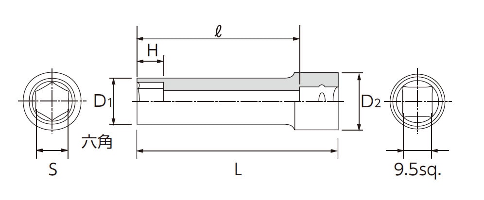 ●差込角…3/8”●サイズ…S:9mm、D1:13.5mm、D2:17mm、H:10mm、L:60mm、l:48.5mm●重量…57g六角タイプ