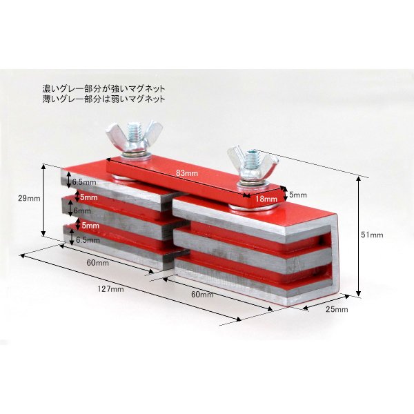 吸着能力:13kgfサイズ:127X25X51(H)mm重量:0.7kg用途:溶接作業や組立作業の仮押えなどに適します。特長:マグネットを2個組み合わせたもので、蝶ネジを使い、角度を自由にセットできます。000012250521 HD