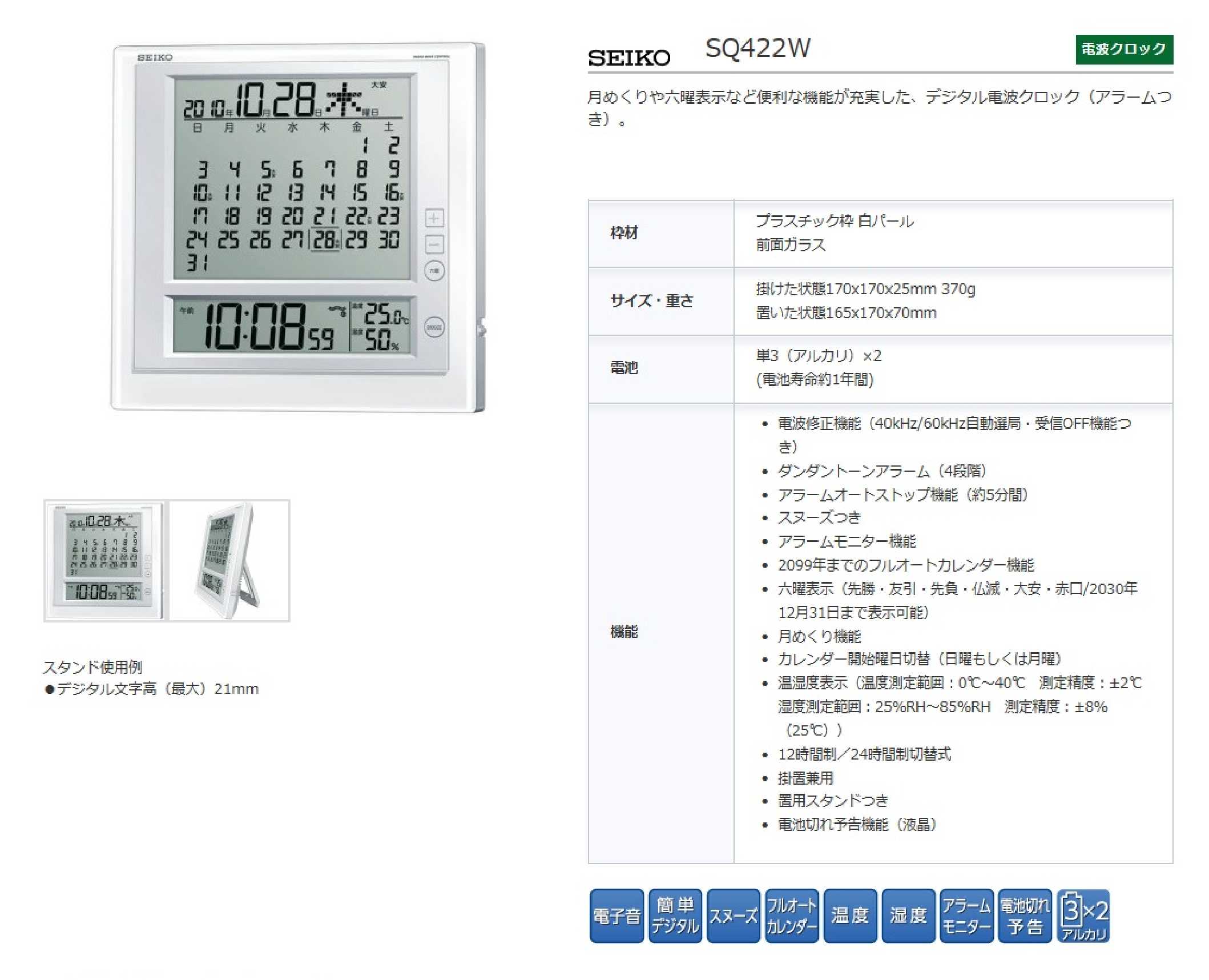 ●サイズ…170×170×25mm●電源…単3電池×2本●周波数…40/60kHz自動選局●温湿度表示…温度:0~40℃、湿度:25~85%RH●重量…370g電波受信機能スタンド付2099年までのフルオートカレンダー、電子アラームマンスリーカレンダー表示(六曜表示付)000012205048 HD