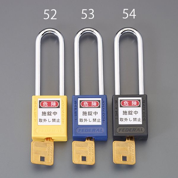 幅(mm):38ツル径(mm):6.35クリアランス(mm):タテ:76 ヨコ:19材質:本体:プラスチック ツル:スチール シリンダー:真鍮色:青鍵1本付ロックアウト用★裏面に管理者名を記入することで、セキュリティレベルを上げることができます。日本語表記ラベルのロックアウト用南京錠4色展開で識別に便利入数:1個
