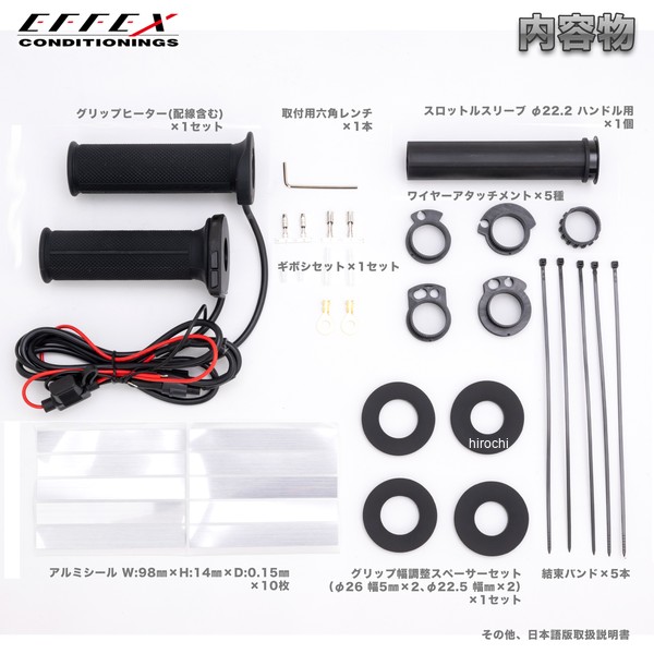 エフェックス EFFEX グリップヒーター G2 φ22.2用 グリップ一体型コントローラー 120/125/130mm 機械式/電子式EFFEX グリップヒーターの発売から8年が経過し、2025年冬待望のリニューアルをしました「EFFEX グリップヒーター G2」全モデルから大幅アップデート!「握る熱で、冬を走り抜け!」※実用新案取得予定【製品説明】■シリコン素材使用従来のゴム素材だと長期間使用すると擦れや屋外の環境にさらされると表面のべたつきが気になりますが、シリコンはそのような劣化が少ない素材です。高品質・高耐候・高耐久■グリップ径φ32純正グリップに近い握りでライディングを邪魔しません。■ハイグリップデザイン従来のゴム素材よりも滑りにくいシリコン素材を使用しています。さらに指側と掌側のデザインによりしっかりと握り込めます。■グリップ幅の調整が可能製品が120㎜幅で、付属の5㎜スペーサーを使用すれば、120㎜/125㎜/130㎜のグリップに対応します。■グリップエンドグリップエンドは非貫通型。非貫通型の状態で使用すればグリップ幅115㎜にも対応。バーエンドを装着する場合は、グリップエンド部分に溝があるので溝に沿ってカットすれば貫通型になります。■急速加熱機能急速加熱モード(下ボタン長押し起動)でわずか4分で最高温度に到達します。■薄型スイッチボックススリムなスイッチボックスでハンドル周りに馴染むデザイン。温度調整も上下ボタン装備で素早く行えます。■電圧保護機能異常電圧を検知すると保護機能が作動し、自動で電流調整や電源OFFを行います。※電圧保護範囲:13.5V~17V■接着剤不要のカンタン装着①左グリップはイモネジを採用。 製品をハンドルに差し込んで付属の六角レンチで締めれば 接着剤不要で緩みません。※付属のイモネジにゆるみ止めが塗布されていますが、 定期的にゆるみがないか確認をしてください。②右グリップのスロットルスリーブに独自構造を採用 付属のスロットルスリーブの特殊構造により接着剤不要で装着が可能。 スリーブがテーパーになっており、 奥まで差し込むと抜けなくなり、 リブ加工を施しているのでグリップとスリーブ間で回らない構造になっています。 従来のグリップヒーターのように熱で接着剤が溶け、緩んでしまう問題が発生しません。※付属のスリーブを使用しなくても、純正のスリーブでも装着は可能です。【スペック】■電源ON/OFF上下どちらかのボタンを長押しで起動します。・上ボタン長押し ⇒ Level.1 でON・下ボタン長押し ⇒ Level.5 でON※加熱状態でどちらかのボタンを長押しすると電源がOFFになります。エンジンを切る前の設定を記憶するので、再設定必要がありません。■2種モード搭載温度調節の上下ボタン両方を同時に10秒押す事でモード切替が簡単にできます。・通常モード Lv1:28°±5° Lv2:36°±5° Lv3:48°±5° Lv4:60°±5° Lv5:75°±5°・省エネモード EVバイクや12V以下のバッテリーを搭載しているバイクでも動作します。※省エネモードでは通常モードよりも加熱機能が低下します。【推奨接着剤】本製品は接着剤無しで装着できますが、心配な方は下記の商品をご使用ください。品名:LOCTITER 480品番:2312268【注意事項】■製品をご使用・取り付けの前に取扱説明書をよく読んでください。■本製品は、専門知識のある販売店もしくは整備工場での取り付けを想定しております。■本製品及び付属品は、改良のため予告無く変更する場合があります。■製品のスペックは試験環境を設定して行っております。実際の使用環境により、記載のスペックと差が出る可能性がありますので、あらかじめご了承ください。■本製品の取り付けには、重要な部品及び関連商品の脱着が伴います。必ず専門知識のある販売店もしくは整備工場で取り付けを行ってください。■本製品を取り付ける際は、平坦で十分なスペースのある場所で、車両のエンジンを停止し必ず冷めてから車両を安定させて行ってください。■取り付け車両メーカー発行のサービスマニュアルを用意し、車両部品の脱着方法及び注意事項を良く理解して作業を行ってください。■変形、損傷、火災事故を避けるために、製品を高温環境や火気の近くに置かないでください。■製品に異常を感じられた場合は、直ちに使用を中止し、取付店舗またはご購入店舗までお問い合わせください。■より重大な事故につながる恐れがありますので、許可なく製品を修理・改造しないでください。■本製品に落下等の衝撃を与えないでください。商品の性能が発揮出来なくなる場合があります。■製品が正常に通電・動作していることを確認してからご使用ください。■製品の耐用年数を伸ばすために、定期的なメンテナンス(電圧、動作の確認など)を行ってください。■製品を使用する場合は、必ず製品の使用環境要件に従い、ご使用ください。範囲外での使用は製品が正しく動作しないか、製品の損傷・車両の損傷につながる恐れがあります。販売備考:製品に耐熱接着剤は付属しません