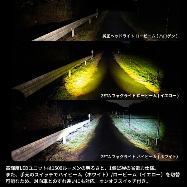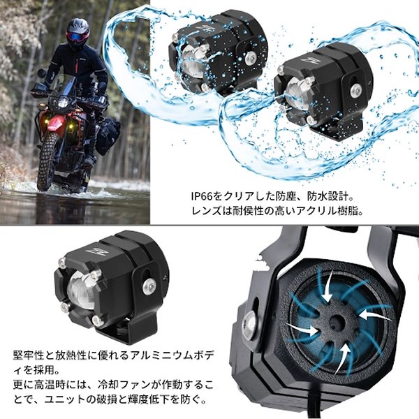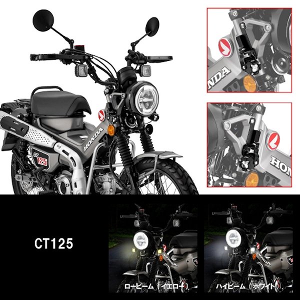 ジータ ZETA LEDフォグライト20年以降 ホンダ CT125(JA55)(JA65)カラー:ブラック電圧:12V/24V 対応消費電力:15W/1個電流:1.4A色温度:イエロー:3000ケルビン、ホワイト:6000ケルビン明るさ:イエロー:1500ルーメン、ホワイト:1500ルーメン重量:約120g/1ユニットサイズ:約38mm×38mm×53mm素材:ユニット本体:アルミニウム合金、取付ステー:ステンレス合金暗い夜道や山間部でヘッドライトの明るさを補い、路肩や見通しの悪い曲がり口などをワイドに照らす、LEDプロジェクター フォグライト。十分な明るさを保持しながら、バッテリーへの負担を考慮した消費電力15Wx2個。車種専用設計によりボルトオン装着。冷却システム、ハイビーム、ロービーム切換え、防塵防水仕様などコンパクトなユニットに凝縮した機能を備える。