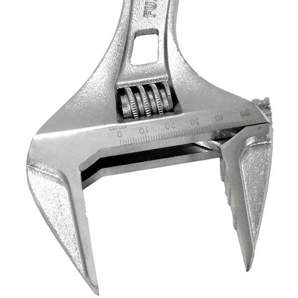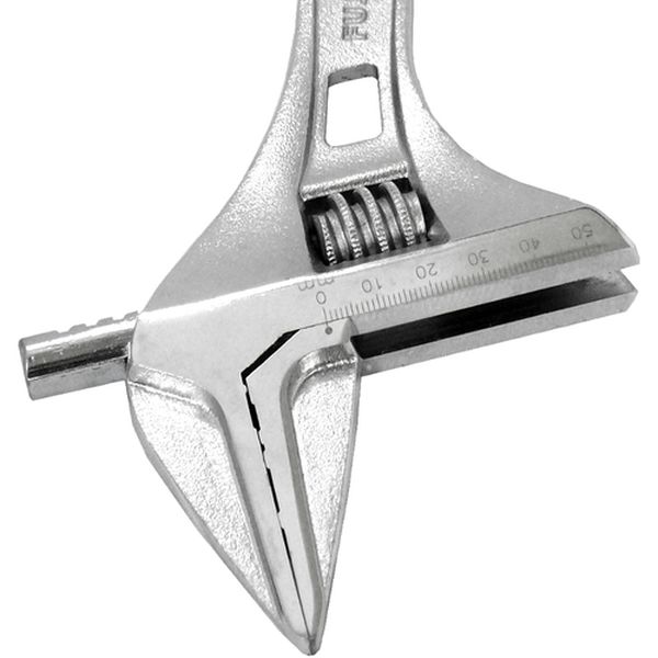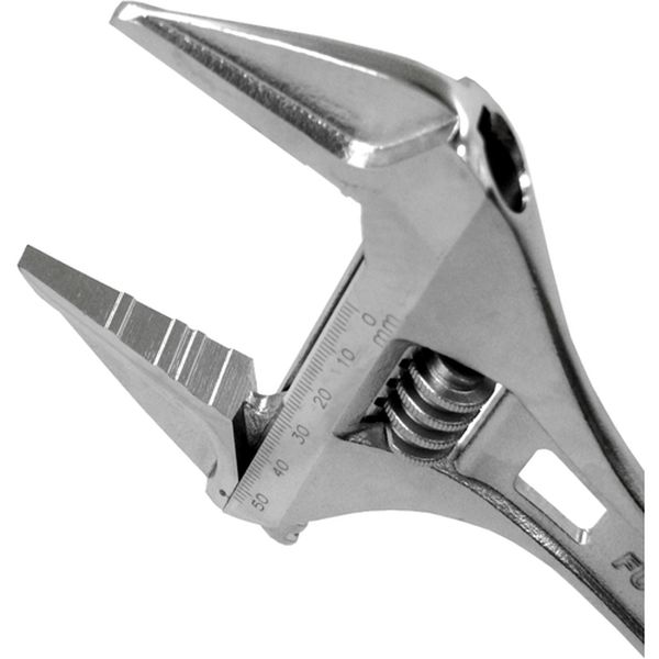 ・軽量・薄型タイプかつワイドな開口です。・狭い場所でさまざまなサイズのボルトを回すのに最適です。・0mmまで閉じるので、小さいものまでしっかりとつかめます。・目盛付です。・でっぱりが少なく狭い場所でも使いやすくなっています。・ボルトやナットの角を傷つけにくい独自形状です。・全長(mm):306・最大口開き(mm):53・薄型、軽量・目盛り付き・特殊鋼・表面処理:クロムメッキ・能力以上の使用はしないで下さい。・生産国 台湾・JANコード 4952520852033・質量 490g・コード:833-8451 ・品目:FLA53F