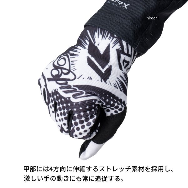ディーエフジー DFG ソリッド グローブ BPM カラーリングサイズ:XLカラー:ホワイト/ブラック素材:ポリエステル90%、スパンデックス6%、ナイロン4%【仕様説明】操作感重視!軽量ノンストレスグローブ。プロFMXライダーで元MX IAライダーの"Nookey"こと金澤巨樹が常識にとらわれること無く自由な発想でデザインする”BPM”。世界中のライダーに支持され、FMXのTAKA東野を始めとして、MXGPのJ・シーワー選手やJMXのJ・ウィルソン選手のヘルメットペイントを手掛ける。伸縮性に優れ、抜群の操作性とフィット感を実現。手の平には従来の合成皮革よりも柔らかく、通気性、耐摩耗性に優れた機能生地「AXスウェード」を採用。操作性と耐久性を併せ持つモトクロスグローブ。【特徴】・甲部には4方向に伸縮するストレッチ素材を採用し、激しい手の動きにも常に追従する。・手の平には「AXスウェード」を採用。 薄く強く、通気性、透湿性にも優れ、汗をかいてもべとつきにくい。・グリップと接する手の平と親指部分は二重構造になっており、耐摩耗性と振動吸収性に優れる。・袖口は柔軟性が高く、長袖ジャージ等に干渉しにくいスリップオンタイプを採用。