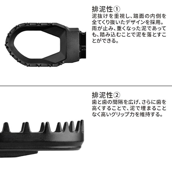 ジータ ZETA MAX フットペグ23年-25年 KTM 125SX23年-25年 KTM 250SX23年-25年 KTM 250-450SX-F24年-25年 KTM 150-500 EXC/EXC-F23年-25年 KTM 125-300XC23年-25年 KTM 250-450XC-F24年-25年 KTM 125-300XC-Wカラー:ブラックサイズ:前後幅60mm素材:クロムモリブデン鋼マッドコンディションでのグリップ力にこだわった、排泥性重視のワイドフットペグ。中央部を大胆にくり抜き、できる限りの泥抜け性能を持たせつつ、簡単には曲がらない強度を確保。プロライダーの走行テストを重ねて強度バランスを調整。前後60mmの広いペグ幅により、スタンディング時の安定性が増すことで、よりアグレッシブなライディングをサポートする。