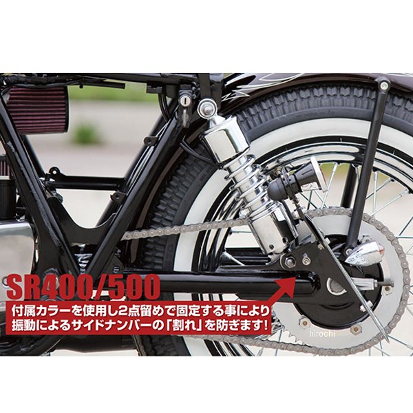 GOODS グッズ サイドナンバーステーヤマハ SR500、SR400(FIモデルにも対応)カラー:ブラック材質:スチールサイズ:横:80.5mm 縦:212mm 奥行き:76.2mm 板厚:3.2mm 取付穴径:10.5mm内容物:本体×1 カラー、取付ボルト、ナット、ワッシャー×1【仕様説明】SR500、SR400用のサイドナンバーステー。割れ防止のSR用カラーが付属。