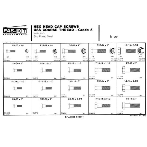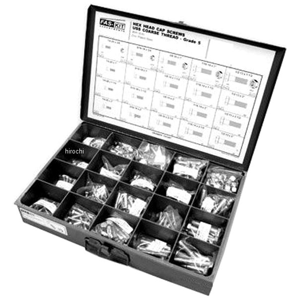 ガッツクローム HEXボルト&ナットセット粗目(インチサイズ)スチールのBOXに入ったセットです。【ボルト】1/4-20x3/4"(約19mm長)×25個1/4-20x1"(約25.4mm長)×25個1/4-20x1-1/2"(約38mm長)×25個1/4-20x2"(約51mm長)×25個5/16-18x3/4"(約19mm長)×25個5/16-18x1"(約25.4mm長)×25個5/16-18x1-1/2"(約38mm長)×25個5/16-18x2"(約51mm長)×25個3/8-16x1"(約25.4mm長)×25個3/8-16x1-1/2"(約38mm長)×25個3/8-16x2"(約51mm長)×25個3/8-16x2-1/2"(約63mm長)×25個7/16-14x1"(約25.4mm長)×25個7/16-14x1-1/2"(約38mm長)×15個7/16-14x2"(約51mm長)×10個7/16-14x2-1/2"(約63mm長)×10個1/2-13x1-1/2"(約38mm長)×10個1/2-13x2"(約51mm長)×10個1/2-13x2-1/2"(約63mm長)×10個1/2-13x3"(約76mm長)×10個【ナット】1/4-20×50個5/16-18×50個3/8-16×50個7/16-14×25個1/2-13×25個
