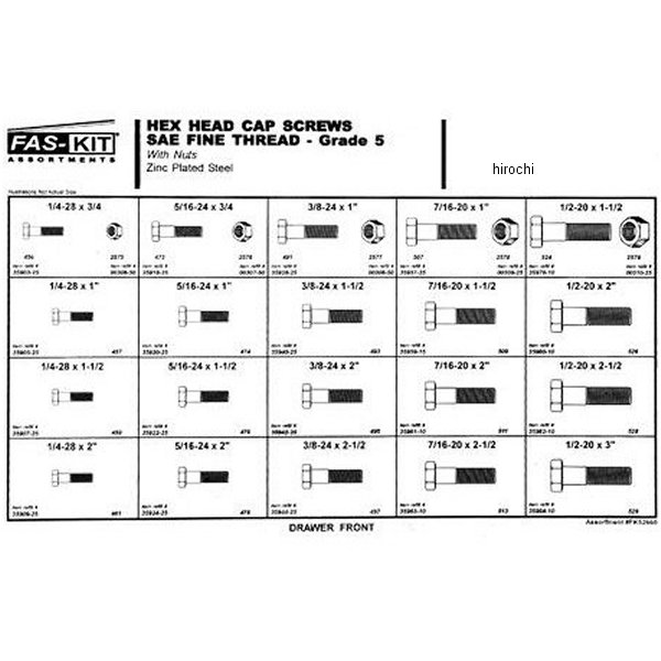 ガッツクローム HEXボルト&ナットセット細目(インチサイズ)スチールのBOXに入ったセットです。【ボルト】1/4-28x3/4"(約19mm長)×25個1/4-28x1"(約25.4mm長)×25個1/4-28x1-1/2"(約38mm長)×25個1/4-28x2"(約51mm長)×25個5/16-24x3/4"(約19mm長)×25個5/16-24x1"(約25.4mm長)×25個5/16-24x1-1/2"(約38mm長)×25個5/16-24x2"(約51mm長)×25個3/8-24x1"(約25.4mm長)×25個3/8-24x1-1/2"(約38mm長)×25個3/8-24x2"(約51mm長)×25個3/8-24x2-1/2"(約63mm長)×25個7/16-20x1"(約25.4mm長)×25個7/16-20x1-1/2"(約38mm長)×15個7/16-20x2"(約51mm長)×10個7/16-20x2-1/2"(約63mm長)×10個1/2-20x1-1/2"(約38mm長)×10個1/2-20x2"(約51mm長)×10個1/2-20x2-1/2"(約63mm長)×10個1/2-20x3"(約76mm長)×10個【ナット】1/4-28×50個5/16-24×50個3/8-24×50個7/16-20×25個1/2-20×25個