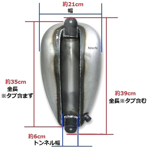 ガッツクローム グラスホッパー ナローピーナッツタンク幅:約21cm長さ(タブ含む):約39cmトンネルサイズ:幅約6cm×最大深さ6cmコック位置:左後方 1/4”(またがった状態で上からみた状態)適合ガスキャップ:アーリーガスキャップ(品番8600-2725)スチール製※汎用品のため、取付け時にノーマルのメインチューブのタブ切断や穴あけ加工が必要になります。※未塗装でのお届けになります。※ガスキャップはカムタイプが適合です。(2500-1003スモールガスキャップ ベントあり)は口径が異なる為使用できません。※ご使用、加工の前には必ずガソリン漏れしないかご確認下さい※タンク内コーティングを行ってからご使用ください。