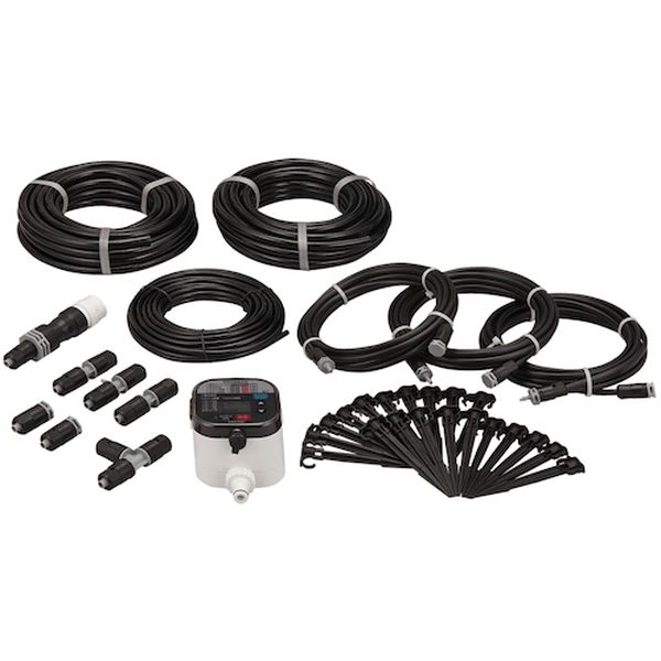 ・蛇口に取り付けて時間設定など簡単な操作をするだけで、自動で水やりができます。・蛇口に取り付けて時間設定など簡単な操作をするだけで自動で水やりできるタイマーと、花壇や家庭菜園などに最適なアイテムを揃えたスターターキットです。・タイマーは乾電池式のためコンセントがなくても使用可能です。・散水用。・適合蛇口外径(mm):14~18・最大使用可能水圧(MPa):0.7・電源(V):単4形アルカリ乾電池4本使用(別売)・ABS樹脂ポリアセタール・AES樹脂・調圧ジョイント×1個・かんたん水やりタイマースタンダード×1個・9mm水やりホース(10m)×1巻9mm・水やりホース(10m)×1巻・点滴チューブスリム(5m)×3巻・9mmジョイントT型×1個・9mmジョイントエンドキャップ×2個・9mmジョイント4mm分岐×3個・兼用ホルダー×20本・生産国 日本・JANコード 4975373154567・質量 3600g・コード:758-2587 ・品目:GKK101