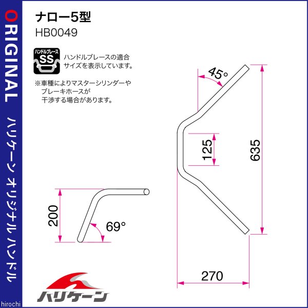 ハリケーン ナロー5型 ハンドルセット01年-08年 ホンダ CB400SSサイズ:外径φ22.2mm 内径φ18mmカラー:クロームメッキ【セット内容】・ナロー5型ハンドル(スイッチ穴加工なし)・スロットルケーブル・クラッチケーブル・チョークケーブル・ブレーキホース※ハンドルスイッチ穴開け加工、ハーネスの延長が必要です。延長ハーネスは年式により異なりますのでご注意下さい。※サイドキャップが別途必要な場合があります。【特徴】ハンドルと必要なケーブル&ホースのセットです。引張強さに優れたSTKM13Aスチール材を使用しJMCA安全基準クリア。耐食性に優れるトリプルニッケルを採用したピュアクロームメッキ。※品質向上のため、ハンドルバーの形状および仕様は予告無しに変更する場合があります。※一般公道使用の場合250cc超のモデルで車検証記載の車体寸法より高さ±40mm 幅±20mmを超える変更を行った場合は改造申請が必要になります。(250cc以下のモデルの場合は改造申請の必要はありません。)