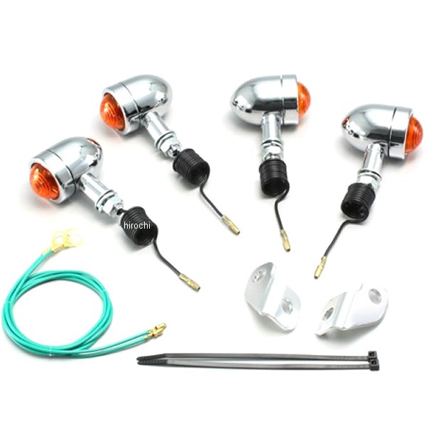ハリケーン ミニブレットウインカー00年-07年 ホンダ FTR22302年 ホンダ FTR223Dウインカーサイズ:外径φ37mm材質:アルミ製クロームメッキ【セット内容】アンダーブラケット取付用ステー取付ボルト(M10×P1.25)オレンジレンズにクリア球組込み(12V15W)×4個※シングル球のみリア側はノーマル位置取付不可※ノーマル車に取付の場合、ステー(HA5593)をご使用ください。※ハリケーン製ウインカーは保安基準による正面から見た灯光部の面積7cm2以上の規定をクリアしています。【特徴】ミニブレットウィンカーはレンズの止めビスがないシンプルな形状です。