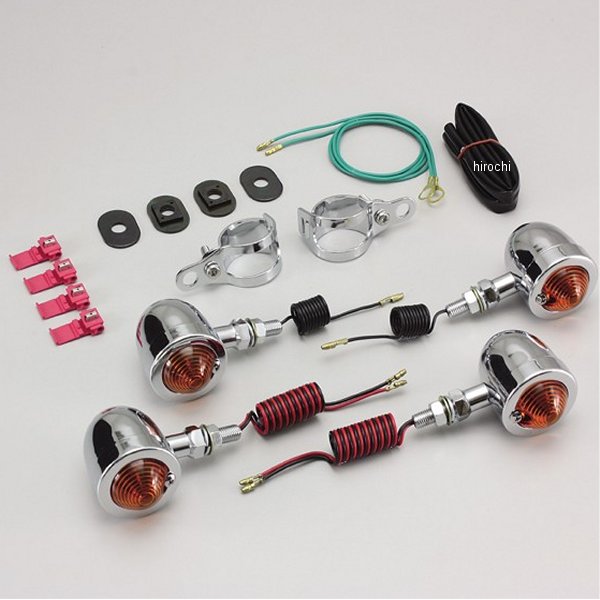 ハリケーン ブレットウインカーキット88年-98年 スティード600/VLX88年-98年 スティード400/VLX/VCLフォークマウントステーウインカーサイズ:φ50mm材質:スチール製クロームメッキ【セット内容】オレンジレンズ 組込球 (12V23/8W 12V23W) 計4個取付ボルト M10×P1.25※ハリケーン製ウインカーは保安基準による正面から見た灯光部の面積7cm2以上の規定をクリアしています。