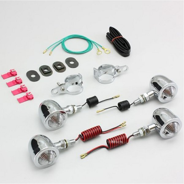 ハリケーン ブレットウインカーキット88年-98年 スティード600/VLX88年-98年 スティード400/VLX/VCLフォークマウントステーウインカーサイズ:φ50mm材質:スチール製クロームメッキ【セット内容】クリアレンズ 組込球 (12V23/8W 12V23W) 計4個取付ボルト M10×P1.25※ハリケーン製ウインカーは保安基準による正面から見た灯光部の面積7cm2以上の規定をクリアしています。