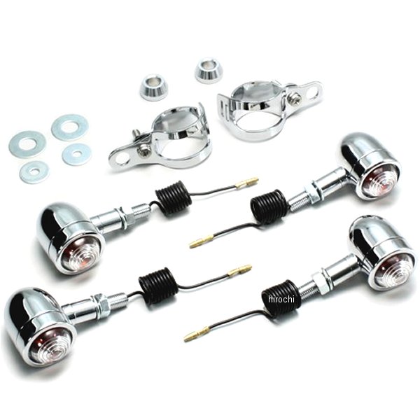 ハリケーン ミニブレットウインカー98年-07年 カワサキ エリミネーター250V90年-93年 カワサキ バルカン95年-98年 カワサキ バルカン95年-98年 カワサキ バルカン295年-97年 カワサキ バルカン800フロント:フォークマウント取り付けリア:ノーマル位置取り付けウインカーサイズ:外径φ37mm材質:アルミ製クロームメッキ【セット内容】クリアレンズにオレンジ球組込み(フロント/リア 12V23W)×4個※シングル球のみ※ハリケーン製ウインカーは保安基準による正面から見た灯光部の面積7cm2以上の規定をクリアしています。【特徴】ミニブレットウィンカーはレンズの止めビスがないシンプルな形状です。