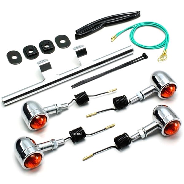 ハリケーン ミニブレットウインカー00年-08年 ホンダ シャドウスラッシャー400フロント:ステムマウント取り付けリア:ノーマル位置取り付けウインカーサイズ:外径φ37mm材質:アルミ製クロームメッキ【セット内容】オレンジレンズにクリア球組込み(12V15W)×4個※シングル球のみ※ハリケーン製ウインカーは保安基準による正面から見た灯光部の面積7cm2以上の規定をクリアしています。【特徴】ミニブレットウィンカーはレンズの止めビスがないシンプルな形状です。